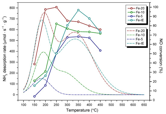 Apart from the structural features, the samples showed different acidic properties. It was found that the ability to adsorb ammonia increased with the decreasing content of iron in the zeolite. The effect was correlated with speciation of Fe, evidenced by UV-Vis spectroscopy. In our case, the highest amount of NH3 was adsorbed by Fe-20 and the material contained almost exclusively isolated iron cations in tetrahedral or octahedral coordination. Thus, the sites most actively interacted with ammonia molecules. What is more, it was observed that in comparison to Fe-IE, the density of acid sites of Fe-20 was not reduced as a consequence of the presence of iron, which typically occurs in the case of post-synthesized Fe-catalysts. The markedly higher concentration of the acid centers of Fe-20 can be explained by (1) the formation of Brönsted and Lewis centers in the form of aluminum species [76] and (2) abundance of the sample in isolated Fe3+ cations, which contribute to higher Lewis acidity [77]. Another important observation is that the density of acid sites in the samples decreased linearly with their specific surface area and micropore surface area. It can be noticed that concentration of acid centers is the highest for Fe-20 and Fe-IE, which exhibited well-developed texture. On the other hand, acidic character of Fe-10 and Fe-5 was visibly weaker. This effect can be explained by the presence of iron oxide clusters, which limited the access of NH3 molecules to the acidic adsorption centers in the catalysts. Additionally, insufficient development of pore structure could limit diffusion of ammonia molecules, which entered the samples. In contrast, Fe-20 and Fe-IE were abundant in the isolated Fe3+ cations, which not only acted as Lewis acid centers, but also did not block the pores of the catalysts. Our results correspond to that obtained by Andonova et al. [79] for Fe-SAPO-34. The authors observed that pore-blocking FexOy clusters and more aggregated iron oxide species cause the loss of NH3 storage capacity. What is more, the correlation of the value of specific surface area and acid sites density in the cited research exhibited similar trend to that obtained within our work. Thus, decreased specific surface area, caused by the migration of Fe3+ cations and formation of pore-blocking particles, contributed to lower ammonia storage capacity. In order to investigate the correlation between surface acidity and catalytic activity of the materials, the results of NH3-TPD and NH3-SCR were presented in Figure 13. The noticeable correlation between the abundance of acid sites and high NO conversion was observed only in the case of Fe-20, since the highest activity of the sample corresponded to the maxima of NH3 desorption peaks in its TPD profile. Additionally, even though the density of acid sites of medium or strong strength was considerably lower or absent for the samples with Si/Fe < 20, the catalysts showed satisfactory high-temperature activity. This result is likely caused by the fact that Fe-20 contained not only isomorphously substituted Fe3+ species, which give rise to low-temperature activity, but also acid sites delivered by Al3+ and Al-OH sites, corresponding to Lewis and Brönsted acid centers, respectively. In the case of Fe-10 and Fe-5, these sites were absent or partially blocked by the clustered aggregates of Fe2O3. However, one can notice that despite Fe-10 contained very limited number of strong acid sites, it was relatively active in the high-temperature region of NH3-SCR. Similar phenomenon was noticed for Fe-5, which did not contain any strong acid centers. Additionally, catalytic activity of these two samples was relatively low in the low-temperature region. Considering Fe-IE, the highest NO reduction was reached above 250 °C, thus, not in the temperature range of the highest acidity. Hence, acidic features of both the one-pot synthesized materials and the reference sample were not the key factor determining their catalytic activity. Our findings support the postulate of Brandenberger and co-workers [80], who declared that especially Brönsted acidity is not required for the adsorption and activation of ammonia during NH3-SCR. Therefore, it can be assumed that the activity of one-pot synthesized materials with Si/Fe < 20 and Fe-IE was determined rather by the presence of polynuclear Fe3+ species or bulky Fe2O3 particles, which is in agreement with findings reported in the literature [69,70]. However, these species also contribute to a side-reaction of NH3-SCR, such as NH3 oxidation and its undesired consumption [69,70]. As a result, the presence of iron sites of higher nuclearity decreased activity of Fe-5 and Fe-IE above 375 °C. Our findings also support Luo et al. [81] hypothesis that the rate determining step for the standard SCR reaction over Fe-zeolite catalysts is NO oxidation. Insufficient amount of iron sites adsorbing NO could lead to the adsorption of NH3 on the acidic sites and its successive, undesired oxidation, especially above 400 °C. Side reactions of NH3-SCR were also catalyzed by bulk particles of Fe2O3, which presence were clearly evidenced by TEM images recorded Fe-5.