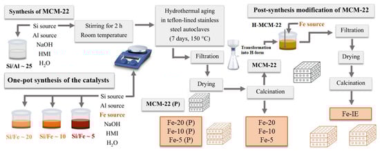 The reference iron-modified MCM-22 was prepared by post-synthesis method, according to the procedure described for various zeolitic materials [41]. Typically, the pristine MCM-22 with Si/Al of ca. 25 was transformed into hydrogen form by ion-exchange with the aqueous solution of NH4NO3. Afterwards, the material was ion-exchanged with iron as it follows: 5 g of H-MCM-22 was kept in contact with the adequate volume of 0.05 mol dm−3 solution of Fe(NO3)3 9H2O at 50 °C overnight. The resulting solid was filtered, washed several times with distilled water, and calcined at 550 °C for 6 h in air. The obtained sample was labeled as Fe-IE. The schematic presentation of the synthesis of the catalysts is demonstrated in Figure 14 and the codes of the prepared samples with the corresponding desired Si/Fe molar ratios are listed in Table 7.
