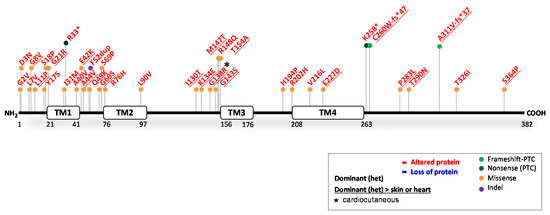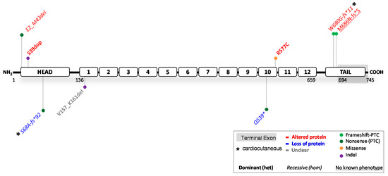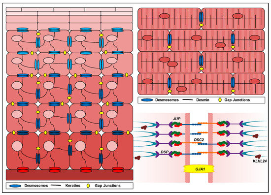 Pathogenic variants in genes encoding for proteins expressed in both skin and heart may cause so-called cardiocutaneous syndromes. These can be inherited in an autosomal dominant or recessive way, and can be life-threatening [1,2,3]. Cardiocutaneous syndromes usually present in childhood with the solitary or combined skin and adnexal features of skin fragility, palmoplantar keratoderma (PPK), woolly hair (WH) and alopecia [3]. When present, the skin fragility phenotype usually persists throughout life and presents as blisters, erosions and wounds with an intraepidermal level of skin separation [2,4,5,6,7]. Cardiomyopathy usually manifests later in adult life, with a high risk of death through arrhythmias or end-stage heart failure [8]. While arrhythmogenic cardiomyopathy (ACM) is the most commonly observed form, with a prevalence of 1:5000, other cardiomyopathies such as dilated (DCM; 1:250), hypertrophic (HCM; 1:500) or non-compaction (NCCM) have also been observed in patients. The underlying cause of this disease is mainly found in genes that encode for commonly shared proteins in the skin and heart, involved in the intercellular compliance network. This network consists of intracellular intermediate filaments anchored to specialized cell–cell connecting structures, called desmosomes. In 2000, the first desmosomal gene variant underlying a cardiocutaneous syndrome was identified as a homozygous DSP variant that translated to a C-terminal truncated desmoplakin protein [1]. Today, many variants have been associated with a disease phenotype, found in desmosomal genes DSP (also known as Carvajal syndrome [9,10]), JUP (also known as Naxos disease [9,11]) and DSC2 [2], the intermediate filament regulating gene KLHL24 [12], and the gap junction gene GJA1 [13] (Figure 1).