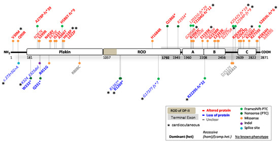 The majority of functionally investigated DSP variants (36/48) led to an altered DP protein (Table 1), due to 23 dominantly and 13 recessively inherited variants. Missense variants were the predominate source for altered DP proteins (n = 27), while the remaining nine variants were due to nonsense or nonsense-inducing variants. Out of the 36 variants, two variants were located near the N-terminus, ten were located in the plakin domain, three in the ROD domain of DPI, six in domain A, five in domain B, two in the linkers, five in domain C and three near the C-terminus. All but one (c.6687del) of the nonsense-inducing variants in the terminal exon of DSP skipped NMD. As expected, the phenotype of patients with an altered DP protein indicated that a recessive mode of inheritance was more severe than a dominant mode of inheritance, mostly due to absence of native protein in the former. Cardiomyopathy was observed in 31/36 of the variant carriers, while it went unobserved or unreported in the others. In the skin, 11/36 variants resulted in PPK (recessive n = 9, dominant n = 2) often with WH (recessive n = 7, dominant n = 2). However, PPK and WH were frequently not observed or not reported in the studies primarily focused on the cardiac phenotype. Furthermore, 10/36 variants caused skin fragility, mostly due to a recessive inheritance (n = 7, dominant n = 3). Variants located in the plakin domain frequently affected the binding efficiency to PG [24,25,26], PPs [59] or intermediate filament anchorage [31,60]. Variants located in domains A, B or C almost always affected the binding affinity to intermediate filaments, especially when causing severe property alterations in domains B and C or loss of these through C-terminal truncation. The functional evidence of the remaining 3/48 variants was inconclusive as to whether it resulted in protein reduction or an altered DP protein.