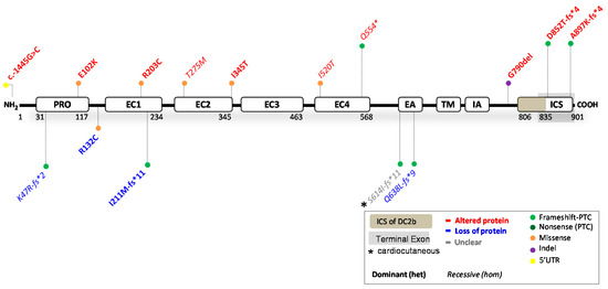 Ten variants (10/15) resulted in an altered DC2 protein (Table 3), which predominantly caused ACM via a dominant (n = 7) or recessive (n = 3) mode of inheritance. Heterozygous variant c.-1445G > C in the 5′UTR affected transcription factor binding mechanisms. Meanwhile, five variants had pronounced effects on the processing of DC2 precursor proteins. For instance, artificial transfection experiments containing missense variants Glu102Lys, Arg203Cys, Thr275Met and Ile345Thr showed punctate cytoplasmic staining, with no or partial ability to be incorporated into desmosomes [84,86,90]. Moreover, nonsense variant Gln554* escaped NMD and resulted in a C-terminal truncated protein, affecting both isoforms [86]. This variant also affected the processing of DC2 precursor proteins, and while a small proportion of maturely processed proteins was incorporated into the desmosome, a larger proportion of precursor proteins remained in the cytoplasm. It is still uncertain whether missense variant Ile520Thr will induce similar alterations that affect the processing of DC2 precursor proteins [80]. Opposingly, nonsense-inducing variants, Asp852Thrfs*4 and Ala897Lysfs*4, only affected isoform DC2a and caused a C-terminal truncated protein. Both were fully processed into a mature protein form, were incorporated into desmosomes, but lost their ability to bind to DP [84] and PG [84,90]. The latter suggests a similar perturbing binding interface for Gln554*. No protein processing information is available on variant Gly790del, other than that it is expressed and translated into a transgenic mouse model. Neither the heterozygous nor homozygous mice showed structural or functional defects in the ventricles or lethal arrhythmias, and only homozygous aged mice showed slight left ventricular dysfunction. This mouse model therefore does not represent the phenotypic severity of the heterozygous Gly790del patients with ACM. In most (7/10) variants, apart from recessive variants Gln554*, Thr275Met and Ile520Thr, ACM was observed in a dominant mode of inheritance. Only recessive inheritance of variant Ser614Ilefs*11 caused PPK and WH, but the functional data were unclear as to whether it causes protein reduction or an altered protein function in patients [87,88]. A skin phenotype was furthermore not observed or went unreported in the other variants.