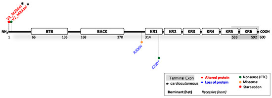 The gene KLHL24 encodes the 68 kDa kelch-like protein 24, referred to as KLHL24 [98]. KLHL24 is part of the kelch-like protein family, which contains 42 identified KLHLs. KLHLs play a key role in ubiquitinating many different substrates, which is mediated by the activity of E3-ligases [99]. From the N- to the C-terminal side, KLHL24 contains a BTB-domain, BACK-domain and six kelch-repeats (Figure 5). KLHL24, specifically, was implicated in the turnover of keratins via ubiquitination and subsequent proteasomal degradation [100]. The ClinVar reported 78 variants in KLHL24. Of these, 37 are claimed (likely) pathogenic; 34 (likely) benign and seven as variants of unknown significance. Eight variants with functional evidence were found (see Figure 5 and full report in Table 4). Furthermore, at least one variant has been translated into a transgenic mouse model, and a zebrafish knockout model has been developed. The predictions on protein level were probably correct in 1/8 variants and incorrect in 6/8 variants, while the evidence of one variant is somewhat inconclusive as to whether protein is produced or not.