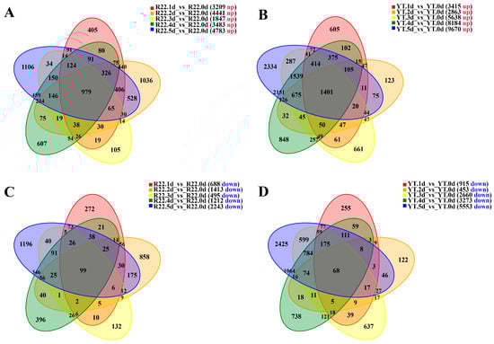 Venn plots of DEGs in ROC22 and YT93-159 post-S. scitamineum infection: Up-regulated DEGs in ROC22 (A) and YT93-159 (B), and down-regulated DEGs in ROC22 (C) and YT93-159 (D), respectively.