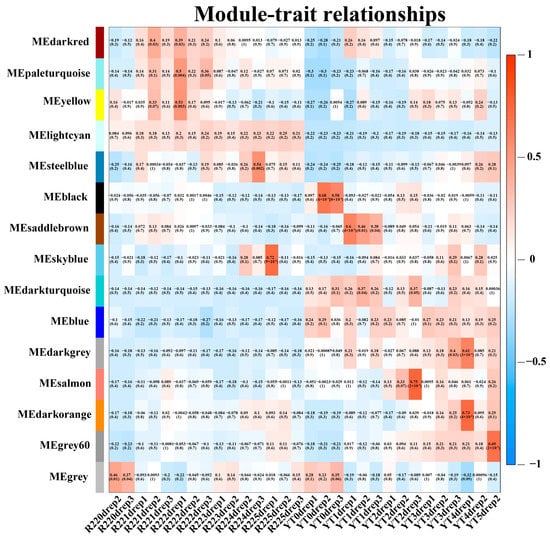 Module-trait associations revealed by Pearson correlation coefficient. The leftmost color column indicates different co-expression modules. The numbers in the figure indicate the correlation between the modules and traits, and the numbers in the parentheses are the correlation p value.
