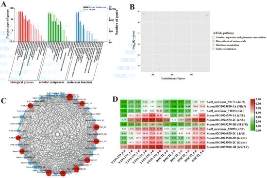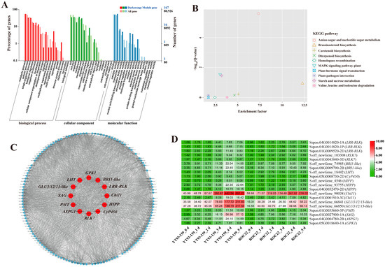 The KEGG enrichment analysis of DEGs in the four target gene modules identified 4, 3, 10, and 34 enriched KEGG pathways, respectively (Figure 5B, Figure 6B, Figure 7B and Figure 8B). The Skyblue module was mainly enriched in three amino acid metabolic pathways, including amino acid biosynthesis (ko01230), histidine metabolism (ko00340), and alanine, aspartic acid, and glutamate metabolism (ko00250). The Salmon module was enriched in glutathione metabolism (ko00480), amino sugar and nucleotide sugar metabolism (ko00520), and phenylpropanoid biosynthesis (ko00940). The Darkorange and Grey60 modules were mainly enriched in amino sugar and nucleotide sugar metabolism (ko00520), MAPK signaling pathway-plant (ko04016), starch and sucrose metabolism (ko00500), plant-pathogen interaction (ko04626), and plant hormone signal transduction (ko04075). In addition, the Grey60 module was also enriched in circadian rhythm-plant (ko04712), flavonoid biosynthesis (ko00941), glutathione metabolism (ko00480), phenylpropanoid biosynthesis (ko00940), and other metabolic pathways (Table S4). In general, the DEGs in the four target gene modules were enriched in stress-related metabolic pathways such as MAPK and hormone signal transduction, starch and sucrose metabolism, plant-pathogen interaction, amino acid metabolic, glutathione metabolism, flavonoid and phenylpropanoid biosynthesis.