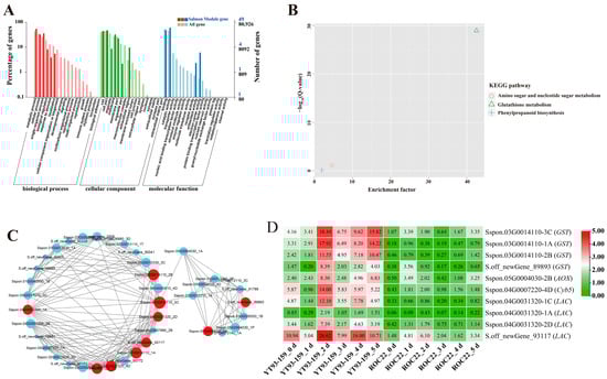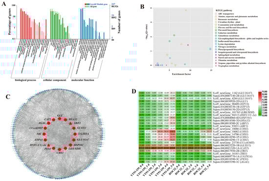 For the four target gene modules, the three most significantly enriched GO terms in the biological process (BP), cellular component (CC), and molecular function (MF) groups were metabolic process, cellular process, and single-organism process in the BP category, cell, cell part and organelles in the CC category, and binding, catalytic activity, and transporter activity in the MF category (Figure 5A, Figure 6A, Figure 7A and Figure 8A). The Skyblue module could be enriched in cellular response to external stimulus (GO: 0071496), glutathione transferase activity (GO: 0004364), and asparagine synthase activity (GO: 0004066). The Salmon module was enriched into glutathione transferase activity (GO: 0004364), chitinase activity (GO: 0004568), oxidoreductase activity (GO: 0016491) and lignin catabolic process (GO: 0046274). The Darkorange module was enriched into chitinase activity (GO: 0004568), transmembrane transporter activity (GO: 0022875), defense response (GO: 0006952), and transmembrane receptor protein serine/threonine kinase activity (GO: 0004675). The Grey60 module was enriched in glutathione transferase activity (GO: 0004364), lignin catabolic process (GO: 0046274), defense response (GO: 0006952), cellular response to external stimulus (GO: 0071496), abscisic acid-activated signaling pathway (GO: 0009738), and aromatic compound biosynthetic process (GO: 0019438) (Table S3). Overall, the DEGs in the four target gene modules could be enriched in the metabolic pathways related to stress resistance, such as cellular response to stress, response to external stimulus, oxidoreductase activity, glutathione transferase activity, and chitinase activity.