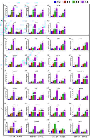 Relative expression of 30 hub genes in sugarcane after inoculation with S. scitamineum by RT-qPCR. (A) Skyblue module. (B) Salmon module. (C) Darkorange module. (D) Grey60 module. 0 d (blue), 1 d (red), 2 d (green), and 5 d (purple) for YT93-159 and ROC22 at 0 d, 1 d, 2 d, and 5 d post-S. scitamineum inoculation, respectively. All data points are mean ± standard error (n = 3). Bars superscripted by different lowercase letters indicate significant differences at 5% level (p ≤ 0.05). A1, SDI1 (sulfur deficiency-induced 1); A2, LSU (LOW SULPHUR UPREGULATED); A3, SULTR (sulfate transporter); A4, APR (adenosine 5’-phosphate sulfate reductase); A5, GAox (gibberellin oxidase); A6, GSTL (glutathione S-transferase lambda); B1, GST (glutathione S-transferase); B2, AOX (alternative oxidase); B3, Gyb5 (cytochrome b5); B4, LAC (laccase); C1, LRR-RLK (leucine-rich repeat receptor-like protein kinase); C2, RLK7 (receptor-like kinase 7); C3, BRI1-like (brassinosteroid insensitive 1-like); C4, LHT (lysine histidine transporter); C5, CyP450 (cytochrome P450); C6, HIPP (heavy metal-associated isoprenylated plant protein); C7, Chi11 (chitinase 11); C8, GLU 3/12/13-like (beta-glucosidase 3/12/13-like); D1, GLU16/47 (beta-glucosidase 16/47); D2, GLU (beta-glucosidase); D3, STP13 (sugar transport protein 13); D4, LKR/SDH (lysine-ketoglutarate reductase/saccharopine dehydrogenase); D5, HSFC1/C-2a (heat shock transcription factor C1/C-2a); D6, HSP101 (heat shock protein 101); D7, HSA32 (heat-stress-associated 32); D8, ABF1 (ABA responsive element binding factor 1); D9, CHS1 (chalcone synthase 1); D10, CCoAOMT (caffeoyl coenzyme A O-methyltransferase); D11, CAT2 (catalase 2); D12, GLYI11 (glyoxalase I 11).