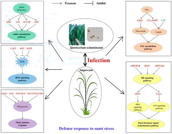 A model of molecular mechanism of sugarcane response to S. scitamineum infection. Positive gene regulators are written in red fonts. Negative gene regulators are written in green fonts. SDI1, sulfur deficiency-induced 1; LSU, LOW SULPHUR UPREGULATED; SULTR, sulfate transporter; APR, adenosine 5’-phosphate sulfate reductase; CAT2, catalase 2; GST, glutathione S-transferase; GSTL, glutathione S-transferase lambda; Chi11, chitinase 11; GLU, beta-glucosidase; GLU16/47, beta-glucosidase 16/47; GLU3/12/13-like, beta-glucosidase 3/12/13-like; CHS1, chalcone synthase 1; CCoAOMT, caffeoyl coenzyme A O-methyltransferase; LAC, laccase; LRR-RLK, leucine-rich repeat receptor-like protein kinase; RLK7, receptor-like kinase 7; BRI1-like, brassinosteroid insensitive 1-like; ABF1, ABA responsive element binding factor 1; GAox, gibberellin oxidase.