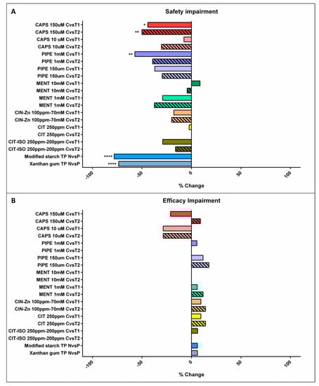 Normalized effect of compensatory and active treatments on signs of safety (A) and efficacy (B). CAPS: capsaicin; PIPE: piperine; MENT: menthol; CIN-Zn: cinnamaldehyde-zinc; CIT: citral; CIT-ISO: citral-isopulegol; C: control nectar; T1: supplemented nectar 1; T2: supplemented nectar 2; N: nectar; P: pudding; TP: thickening product; *: p < 0.05; **: p < 0.01; ****: p < 0.0001.