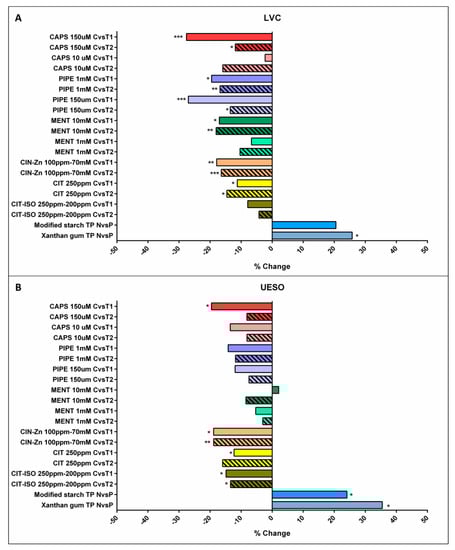 The three types of TRP agonists (TRPV1, TRPA1 and TRPM8 agonists) significantly reduced the time to LVC when compared with their own controls: capsaicin 150 µM (T1: 27.6%, p = 0.0006; T2: 11.9%, p = 0.0499), piperine 1 mM (T1: 19.5%, p = 0.0117; T2: 16.8%, p = 0.0061) and 150 µM (T1: 27.0%, p = 0.0003; T2: 13.5%, p = 0.0120), menthol 10 mM (T1: 17.0%, p = 0.0364; T2: 18.0%, p = 0.0102), CIN-Zn (T1: 17.9%, p = 0.0057; T2: 16.4%, p = 0.0009) and CIT (T1: 11.3%, p = 0.0195; T2: 14.6%, p = 0.0438) (Figure 2a). Capsaicin 150 µM and piperine 150 µM reduced time to LVC significantly more than menthol 1 mM, CIT and CIT-ISO (Table S2).