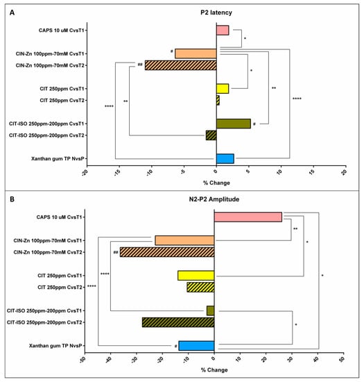Normalized effect of compensatory and active treatments on the latency of P2 peak (A) and N2-P2 amplitude (B). CAPS: capsaicin; CIN-Zn: cinnamaldehyde-zinc; CIT: citral; CIT-ISO: citral-isopulegol; C: control nectar; T1: supplemented nectar 1; T2: supplemented nectar 2; N: nectar; P: pudding; TP: thickening product; #: p < 0.05; ##: p < 0.01 compared to its own control; *: p < 0.05; **: p < 0.01; ****: p < 0.0001 compared to the other treatments.