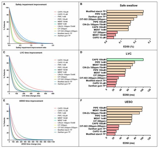 On the left, one-phase decay curves for the proportion of patients with improved signs of safety (A), time to LVC (C) and time to UESO (E). On the right, graphical representation of ED50 of each treatment classified as high (green bars), intermediate (orange bars) and low (red bars) therapeutic effect for signs of safety (B), time to LVC (D) and time to UESO (F). CAPS: capsaicin; PIPE: piperine; MENT: menthol; CIN-Zn: cinnamaldehyde-zinc; CIT: citral; CIT-ISO: citral-isopulegol; TP: thickening product; LVC: laryngeal vestibule closure; UESO: upper esophageal sphincter opening.