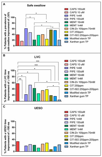 Graphical representation of percentage of patients that increased safe swallows at least 30% (A), reduced time to of LVC by 100 ms (B) and time to UESO by 100 ms (C). CAPS: capsaicin; PIPE: piperine; MENT: menthol; CIN-Zn: cinnamaldehyde-zinc; CIT: citral; CIT-ISO: citral-isopulegol; TP: thickening product; LVC: laryngeal vestibule closure; UESO: upper esophageal sphincter opening; *: p < 0.05; **: p < 0.01; ***: p < 0.001.