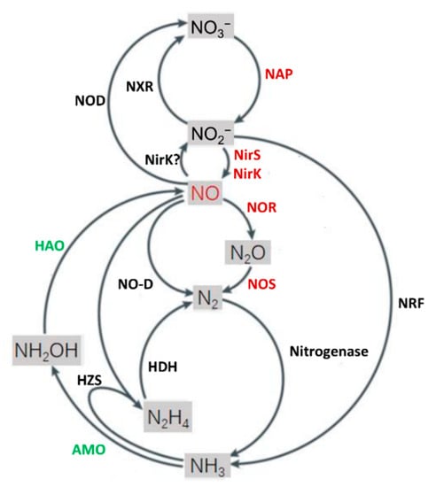 NO-centered transformation of inorganic nitrogen compounds in bacteria. Redox reactions include reduction of NO3− to NO2− by dissimilatory periplasmic nitrate reductase (NAP), reduction of NO2− to NH3 by dissimilatory periplasmic cytochrome c nitrite reductase (NRF), reduction of NO2− to NO by heme-containing (cd1-type, NirS) or copper-containing (Cu-type, NirK) nitrite reductases, oxidation of NO to NO2− by NirK (?, this process is still under debate [15]), reduction of NO to N2O by nitric oxide reductase (NOR), reduction of N2O to N2 by nitrous oxide reductase (NOS), reduction of NO to N2 by nitric oxide dismutase (NO-D), oxidation of NO to NO3− by nitric oxide oxidase (NOD), oxidation of NO2− to NO3− by nitrite oxidoreductase (NXR), oxidation of NH3 to NH2OH by ammonia monooxygenase (AMO), oxidation of NH2OH to NO by hydroxylamine oxidoreductase (HAO), reduction of N2 to NH3 by nitrogenase, reduction of NO to NH2OH and subsequent condensation with NH3 to form N2H4 by hydrazine synthase (HZS), and oxidation of N2H4 to N2 by hydrazine dehydrogenase (HDH). Denitrification and ammonia oxidation pathways that generate NO are in red and green, respectively.