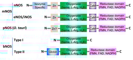 Structural organizations of mNOS, plant NOS (pNOS), and bNOS. mNOSs exists in three isoforms, nNOS, eNOS and iNOS. pNOSs have only been found in green algae species, as in O. tauri. bNOSs can be grouped into two types; a large majority of bNOSs belong to type I, which is composed of only one oxygenase domain homologous to that of mNOS. Type II bNOSs are rather rare, found only in a few species, that contain an N-terminal globin domain in addition to oxygenase and reductase domains, as seen in photosynthetic cyanobacterium Synechococcus PCC 7335.