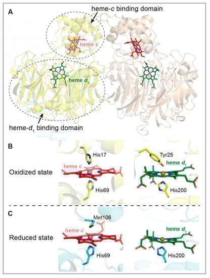 Structures of (A) cytochrome cd1 associated nitrite reductase (NirS) from P. pantotrophus and the conformational changes of the heme coordination in oxidized (B) and reduced (C) states. From oxidized state to reduced state, the coordinated residues at the distal sides of heme c and heme d1 changed from His17 to Met106 and from Tyr25 to solvent molecules (PDB ID: 1AOF).