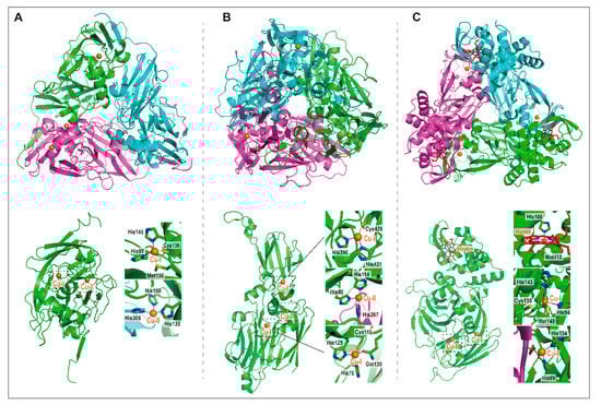 NirKs are homotrimers with each subunit harboring two distinct copper centers; one (Cu-I) is responsible for the electron transfer and the other (Cu-II) works as the catalytic site. The Cu-I is located at the interior of each monomer while the Cu-II resides at the interface between monomers, causing the copper ions to experience different local environments [17] (Figure 4A). The copper ion of Cu-I is coordinated by two histidines, one cysteine and one methionine, while the copper ion of Cu-II is coordinated by three histidines and a solvent molecule [34] (Figure 4A). In addition, two atypical NirKs isolated from Thermus scotoductus and Ralstonia pickettii were found to possess one extra copper center (Cu-I) and one additional heme-containing domain, respectively [35,36] (Figure 4B,C).
