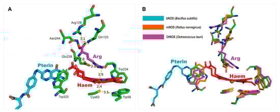 The oxygenase domain of all NOSs contains a heme-containing catalytic pocket which provides the binding sites for substrate (Arg). Together with the adjacent pterin, a triangular association between heme, pterin, and Arg mainly via hydrogen bonds forms the catalysis reaction center for NO formation (Figure 5B). The proximal cysteine coordinates with the heme-iron and forms hydrogen bonds with a nearby tryptophan, and this Cys–Trp interaction is thought to increase the heme redox potential and to regulate the NOS-mediated catalysis process [74,75,76,77]. In mNOSoxy, a protruded hydrophobic ‘helical lariat’ binds one pterin (BH4), while bNOS conserves only a partial counterpart pterin-binding site. Instead, the pterin molecule in bNOS is stabilized by forming hydrogen bonds with the heme propionate D and substrate Arg, and by a π-π stacking interaction with a conserved Trp residue. Substrate Arg locates at the distal side of porphyrin ring, with its guanidino group close to the central iron atom and its amino/carboxyl groups forming hydrogen bonds with three residues (tyrosine, tryptophan, and glutamate) above. Additionally, a conserved Isoleucine adjacent to the substrate Arg in bNOS substitutes for a conserved counterpart valine which is related to efficient NO release in mNOS [76,77].