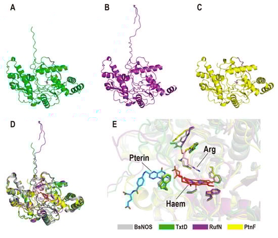 Some specific bNOSs have been found to participate in regulation of biosynthesis for some bacterial natural products (NPs). During the synthetic processes of thaxtomin A and rufomycin, two bNOSs (TxtD and RufN) provide NO molecules for the NO-dependent nitration reaction, catalyzed by cytochrome P450 homologues (TxtE and RufO), respectively [28,55,78,79,80]. Another bNOS (PtnF) was reported to involve an enzymatic and non-enzymatic cascade which caused the formation of a rare 1,2,3-triazolopyrimidine scaffold [55]. Although involved in the biosynthesis of different natural products, these special bNOSs exhibit similar spatial organizations and highly conserved catalytic centers like those of typical bNOSs, according the structures in the AlphaFold database [81,82] (Figure 6).