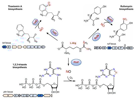 In recent years, a new understanding of the role of NO in biosynthesis of secondary metabolites in bacteria has been established [28]. Upon NO exposure, nitration (R-NO2) and nitrosation (R-NO) of biomolecules can both occur, resulting in inhibition of metabolic enzymes and DNA damage [86]. However, these processes can be repurposed by bacteria for synthesizing natural products. The biosynthesis of thaxtomin A relies on an NO-forming protein and a metalloenzyme catalyzing the NO-dependent chemistry, which are encoded by txtD and txtE, respectively, in the thaxtomin A biosynthetic gene cluster [60,78] (Figure 8). During the biosynthetic process, TxtD oxidizes Arg for production of pathway-dedicated NO, which provides a nitro group to be incorporated into L-Trp to form 4-nitrotryptophan, following a nitration reaction catalyzed by TxtE [28,78]. Although the precise mechanism remains to be fully elucidated, a similar strategy appears to be employed for biosynthesis of rufomycin, which relies on bNOS RufN and RufO that catalyze the NO-dependent chemistry [79,80] (Figure 8). Interestingly, this strategy does not apply to biosynthesis of 1,2,3-triazole [65] (Figure 8). Despite the non-enzymatic nature of the nitrosative cyclization reaction involving NO, the triazole biosynthesis system requires a pathway-specific bNOS, i.e., PtnF [65] (Figure 8). The role of NO in natural product biosynthesis stresses clearly the proximity effect of NO in bacteria. It should be noted that the current understanding of the NO-dependent biosynthesis of natural products is just the tip of the iceberg. A BLASTp search against TxtD returns over 500 results, implying that NO-dependent pathways are clearly underexplored [28]. In addition, there likely exist NO-dependent pathways that do not depend on a dedicated NO former, a strategy that has been suggested in the biosynthesis of pyrrolomycin and coenzyme F430 [71,119].