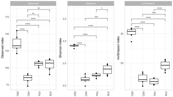 Alpha-diversity of four consortia (OS2, OS4, SD4, BL6) accessed by 3 indices—Observed, Shannon, InvSimpson, based on 16S rRNA gene libraries. Significant differences assessed by the Mann–Whitney test: (*) p-value ≤ 0.05; (**) p-value ≤ 0.01; (***) p-value ≤ 0.001; (****) p-value ≤ 0.0001.