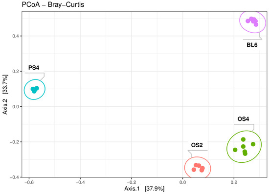 PCoA plot of the beta-diversity of the four cellulolytic consortia (OS2, OS4, PS4, BL6) accessed with Bray–Curtis, based on 16S rRNA gene amplicon libraries.