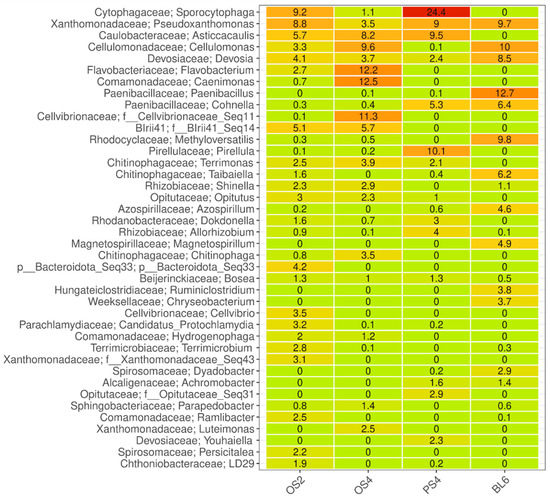According to amplicon sequencing, the main components of all consortia belonged to Proteobacteria and Bacteroidota phyla (Figure S4). To select the minimal cellulolytic community, consortia cultivated from the maximum dilution of the substrate, which retained the ability to decompose the paper filter, were taken into the study. Despite this, it turned out that each consortium consists of around a hundred phylotypes. Almost all of them were unique to different substrates, and only three minor phylotypes belonging to Xanthobacter, Pseudoxanthomonas and Dokdonella) were common for all four consortia (Figure S5). However, phylotypes pooled on the genus level revealed overlapping representatives. Major genera can be seen on the heatmap with relative abundance data (Figure 4). Pseudoxanhtomonas and Devosia genera from Proteobacteria were a major part in all consortia. Other phylotypes were distributed more differentially: Sporocytophaga (Bacteroidota) in OS2 and PS4; Asticcacaulis (Proteobacteria) in OS2, OS4, and PS4; Cellulomonas (Actinobacteroidota) in OS2, OS4, and BL6; Caenimonas and Cellvibrionaceae (Proteobacteria) in OS4; Flavobacterium (Bacteroidota) and Blrii41 (Myxococcota) in OS2 and OS4; Paenibacillus (Firmicutes) and Methyloversatillis (Proteobacteria) in BL6; Cohnella (Firmicutes) in PS4 and BL6; Pirellula (Planctomycetota) in PS4.
