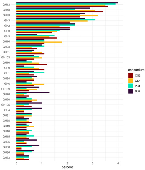 The most widely represented groups of GH families are shown in Figure 6. The functional pattern is similar for all consortia, with the prevailing presence of GH13, GH43, GH23, and GH3 families. However, the opposite situation could be described for CBM-their pattern differs between consortia (Figure S11). Families CBM6, CBM 35, and CBM44 were more characteristic of the consortium PS4, families CBM2 and CBM13, of OS2 and OS4, and families CBM16, CBM32, CBM61, and CBM66-of BL6. The highest proportion value of CBMs in the metagenomes was in BL6 consortium (3.2%), and the lowest in OS2 (1.7%).