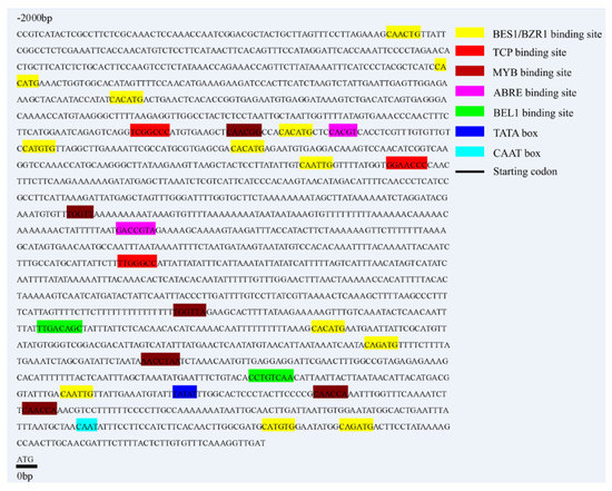 To identify the promoter sequence for regulatory motifs, the sequence of 2000 bp upstream of the MdCoL gene was cloned and submitted to the PlantCARE database and PlantRegMap for bioinformatics analysis. As shown in Figure 1, some cis-regulatory elements and TF binding sites were mapped in the MdCoL promoter. TATA-box and CAAT-box were 252 bp and 113 bp upstream of the start codon. In addition, we identified two ABA response elements ABRE (−1481 bp, −1054 bp), six MYB binding sites (−201 bp, −226 bp, −415 bp, −646 bp, −1139 bp, −1499 bp), three TCP binding sites (−897 bp, −1316 bp, −1516 bp), two BEL1 binding sites (−318 bp, −593 bp), and twelve BES1/BZR1 binding sites (−65 bp, −79 bp, −273 bp, −454 bp, −543 bp, −1332 bp, −1421 bp, −1458 bp, −1490 bp, −1510 bp, −1673 bp, −1769 bp, −1934 bp).
