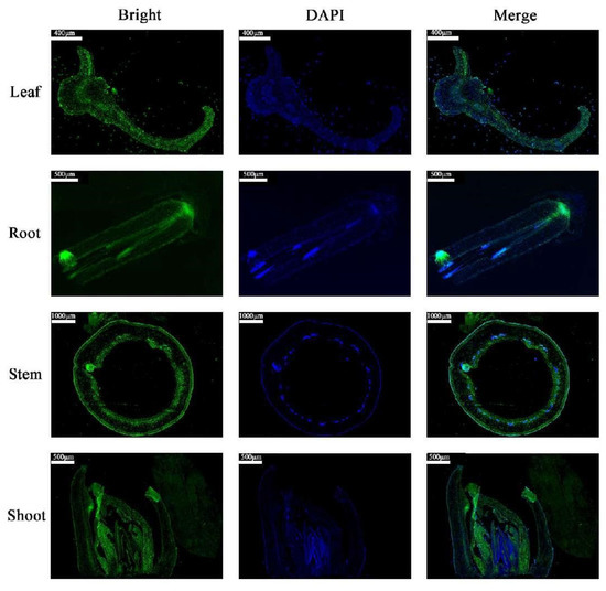 In situ hybridization of mRNA of MdCoL in leaf, root, stem and bud of columnar apple ‘Wijcik McIntosh’. “Bright” means the fluorescent signals were observed directly, “DAPI” means the fluorescence signal after DAPI (2-(4-Amidinophenyl)-6-indolecarbamidine dihydrochloride) staining. “Merge” represents the superposition image of the above two fluorescence signals.