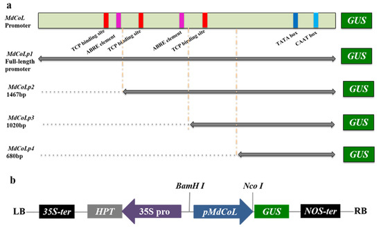 The GUS activity of the full-length promoter was the weakest among the four promoters mentioned above; compared with the full-length promoter MdCoLp1 and the three short promoters MdCoLp2, MdCoLp3 and MdCoLp4, there was an extra 533 bp promoter sequence in MdCoLp1. Except for ABRE and the TCP binding site, this region may contain a binding site for an inhibitor that reduces the activity of MdCoLp1.