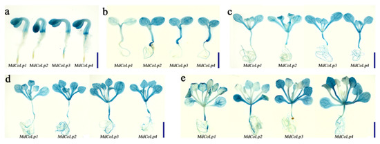 Histochemical staining of GUS in Arabidopsis plants transformed with the MdCoLp1/2/3/4::GUS construct. The age of Arabidopsis seedlings in (a–e) were 2 days, 5 days, 12 days, 18 days and 25 days, respectively. The scale bar of (a–e) is 2 mm.