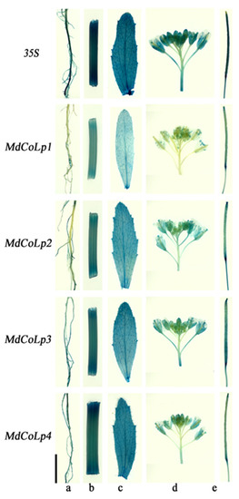 Histochemical staining of GUS in roots (a), stems (b), cauline leaves (c), inflorescences (d) and siliques (e) of Arabidopsis transformed with the construct of MdCoLp1/2/3/4::GUS and 35S::GUS at 35 days of seedlings Scale bar is 2 mm.