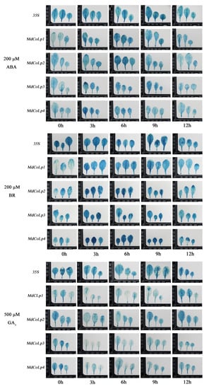 Effect of exogenous hormones treatment on the GUS histochemical staining of transgenic Arabidopsis plants transformed with the construct of MdCoLp1/2/3/4::GUS and 35S::GUS. The leaves used for 200 μM ABA, 200 μM BR and 500 μM GA3 treatment were rosette leaves of transgenic Arabidopsis growing normally for 30 days. A set of three leaves represent three transgenic Arabidopsis lines, respectively.