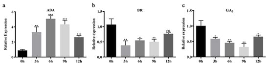 The expression of MdCoL in columnar apple ‘Wijcik McIntosh’ under different hormones treatments. The expression levels were detected in ‘Wijcik McIntosh’ seedlings at 0, 3, 6, 9 and 12 h after treatment with 200 μM ABA (a), 200 μM BR (b) and 500 μM GA3 (c). Error bars show standard deviation from three independent biological replicates (* p < 0.05; ** p < 0.01; *** p < 0.001; “ns” means no significant difference).