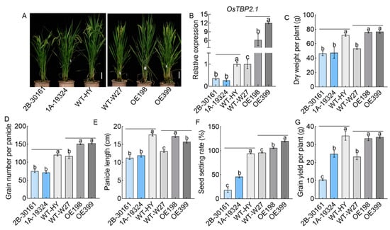 Phenotype of OsTBP2.1 T-DNA insertion mutant and OsTBP2.1 overexpression lines. (A) Characterization of T-DNA insertion mutant lines (ostbp2.1, 1A-19324 and 2B-30161) and OsTBP2.1 overexpression lines (OE, OE198 and OE399) in a field experiment. Wild-type, Huangyang (WT-HY) and Wuyunjing27 (WT-W27). (Bar = 20 cm). (B) The expression of OsTBP2.1 in the OE lines and ostbp2.1 lines. Error bars: SE (n = 3). At the maturity stage of OE lines and ostbp2.1 lines, dry weight (C), grain number per panicle (D), panicle length (E), seed setting rate (F), and grain yield per plant (G) were taken from the field. Error bars: SE (n = 5). The different letters indicate a significant difference between each other (p < 0.05).
