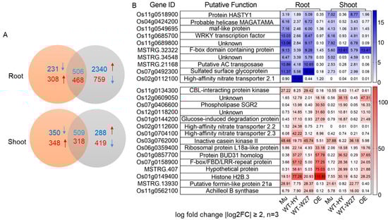RNA-seq analysis of OsTBP2.1 overexpression lines and T-DNA insertion mutant lines. (A) The number of different expression genes (DEGs) identified by the RNA-seq dataset in the roots and shoots of OE and ostbp2.1. The samples taken from the shoots and roots of OsTBP2.1 overexpression lines (OE) and T-DNA insertion mutant lines (ostbp2.1). Blue arrow, downregulated genes in OE and ostbp2.1. Red arrow, upregulated genes in OE and ostbp2.1. (B) Individual accession number, putative function, and relative expression of the 25 genes selected from (A). Log fold change |log2FC|≥2 of the RNA-seq analysis (n = 3).