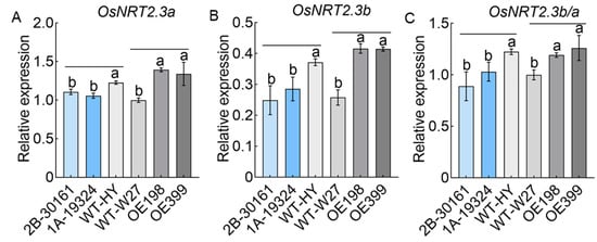 The expression of OsNRT2.3a and OsNRT2.3b in the T-DNA insertion mutant lines and OsTBP2.1 overexpression lines. The expression of OsNRT2.3a (A) and OsNRT2.3b (B) in the OE lines and ostbp2.1 lines. (C) The expression ratio of OsNRT2.3b to OsNRT2.3a in the OE lines and ostbp2.1 lines. Error bars: SE (n = 3). Significant differences between ostbp2.1 and WT-HY, OE, and WT-W27 are indicated by different letters (p < 0.05).