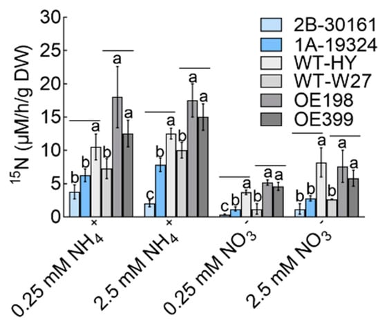 As most of the N uptake by rice is distributed in the grain, rice with a higher N uptake capacity generally produces a higher yield. To explore how OsTBP2.1 modulates N uptake in rice, we measured and analyzed the 15N-NH4+ and 15N-NO3− influx rates in OE and ostbp2.1. The influx rate of 15N was decreased in ostbp2.1 compared with that in WT-HY; however, it was increased under all 15N treatments in the OE lines compared with that in WT-W27 (Figure 4). Under the four treatments of 0.2 mM 15N-NH4+, 2.5 mM 15N-NH4+, 0.2 mM 15N-NO3−, and 2.5 mM 15N-NO3−, the influx rate of 15N in OE increased by approximately 110.0%, 62.5%, 306.0%, and 154.0%, respectively; however, in ostbp2.1, the 15N influx rate decreased by approximately 52.4%, 60.8%, 79.1%, and 75.6%, respectively (Figure 4). These results indicate that OsTBP2.1 affects NH4+ and NO3− uptake, particularly at low concentrations of N-NO3−.