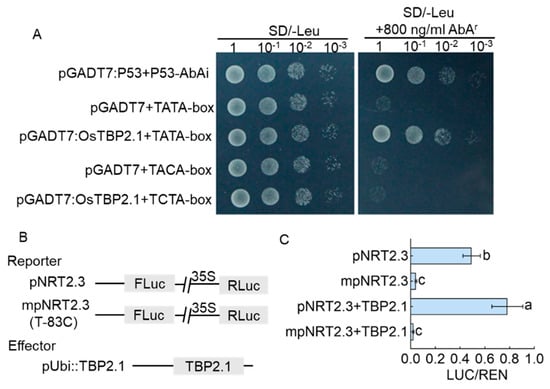 To verify OsTBP2.1, combined with the cis-acting elements of OsNRT2.3, we used the Softberry website (accessed on 1 May 2019) to analyze the sequence before the ATG of OsNRT2.3. We identified that the sequence of ATGCTATAAGAGC (from −89 to −77 bp upstream of OsNRT2.3 ATG) was the motif for the TATA-box. We performed a yeast one-hybrid assay, using OsTBP2.1 as a DNA-binding protein and the TATA-box of OsNRT2.3 as the binding site, to determine whether a TATA-box binding protein interacted with ATGCTATAAGAGC within the OsNRT2.3 promoter. The results show that OsTBP2.1 can bind to the TATA-box of OsNRT2.3, indicated by growth in the SD/-Leu medium containing 800 ng/mL aureobasidin A (AbAr) (Figure 5A). To further determine whether OsTBP2.1 plays a role in the transcriptional activity of OsNRT2.3 promoters and whether this effect is dependent on the TATA-box, we conducted transient expression assays using a dual-luciferase reporter assay system (Figure 5B). OsTPB2.1 expression was controlled by the ubiquitin1 promoter, and the luciferase coding sequence was controlled by the OsNRT2.3 promoter with C or T at position −83 bp upstream of OsNRT2.3 ATG (Figure 5B). Both reporter and effector vectors were co-transformed into rice protoplasts. We found that OsTBP2.1 enhanced the expression of the pNRT2.3-LUC fusion genes in the WT promoter (pNRT2.3) but not in the mutant promoter (mpNRT2.3) (Figure 5C). These results showed that OsTBP2.1 promotes the transcriptional activity of the OsNRT2.3 promoter and that the TATA-box of OsNRT2.3 acts as a regulatory switch.