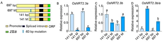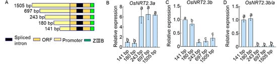 Effect of different OsNRT2.3 promoter lengths on OsNRT2.3a and OsNRT2.3b expression in rice. (A) Schematic representation of the different OsNRT2.3 promoter fragments 141, 180, 243, 697, and 1505 bp, driving the expression of the 437 bp open reading frames (ORF) of OsNRT2.3 and the ZIIIB reporter gene. Black frames, spliced intron. Brown frames, ORF of OsNRT2.3a and OsNRT2.3b. Yellow frames, promoters of OsNRT2.3. Green frames, ZIIIB reporter gene, division OsNRT2.3a and OsNRT2.3b. Obtained transgenic lines planted in a solution containing 1.25 mM NH4NO3 of IRRI. The expression of OsNRT2.3a (B) and OsNRT2.3b (C) in the lines of different lengths of OsNRT2.3 promoters was derived. (D) The expression ratio of OsNRT2.3b to OsNRT2.3a in the lines of different lengths of OsNRT2.3 promoters was derived. Error bars: SE (n = 3). Significant differences between the lines are indicated by different letters (p < 0.05).