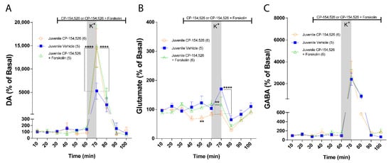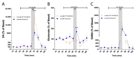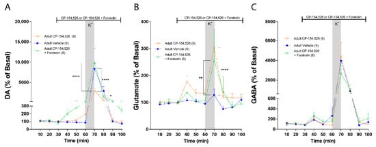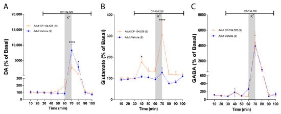 2.1. CRF-R1 Maintains an Inhibitory Tone upon DA and an Excitatory Tone upon Glutamate in the NAc of Juvenile Rats