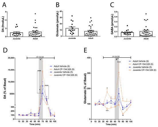 Zegers-Delgado, J.; Aguilera-Soza, A.; Calderón, F.; Davidson, H.; Verbel-Vergara, D.; Yarur, H.E.; Novoa, J.; Blanlot, C.; Bastias, C.P.; Andrés, M.E.; et al. Type 1 Corticotropin-Releasing Factor Receptor Differentially Modulates Neurotransmitter Levels in the Nucleus Accumbens of Juvenile versus Adult Rats. Int. J. Mol. Sci. 2022, 23, 10800. https://doi.org/10.3390/ijms231810800