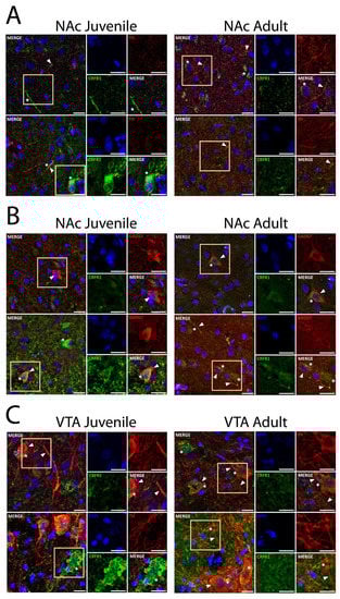 2.5. CRF-R1 Localization in the NAc and VTA of Juvenile versus Adult Rats