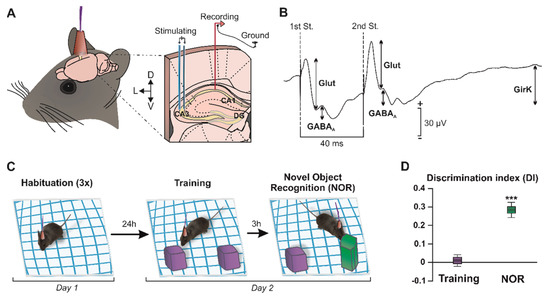 Experimental design. (A) The picture illustrates how mice were prepared for chronic recording of fPSPs in the hippocampal CA1 region, by surgical implantation of bipolar stimulating electrodes on the right Schaffer collaterals, and bipolar recording electrodes at ipsilateral CA1. A bare silver wire was fixed to the skull as ground. (B) Representation of the fPSPs evoked in the CA1 hippocampal region after paired-pulse stimulation (40-ms interstimulus interval) at the Schaffer collaterals. The representative recording illustrates the averaged (n = 50) profile of the postsynaptic response. For each fPSP, the maximum amplitude (peak-to-peak value, see arrows) was measured for the analysis. DG, dentate gyrus; St., stimulus; D, dorsal; L, lateral; V, ventral; and Glut, glutamate. (C) NOR task. The object recognition protocol consisted of three 5-min habituation sessions with the empty box (interval of 1.5 h between the habituations) on day 1. On day 2, two identical objects were placed (purple cubes) in the center of the box and the animals (n = 36) were allowed to explore them for 10 min (training session). Three hours later, one of the objects was replaced by a novel one (green prism) for the NOR session. (D) Graph representing the discrimination index (DI) during the training (two identical objects) and NOR (familiar vs. novel object) sessions. DI = 0, no discrimination between objects. *** p < 0.001 vs. DI = 0.