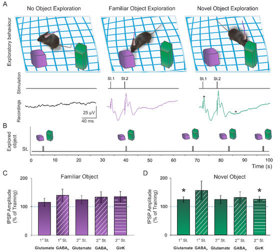 Memory-induced synaptic plasticity. (A) During the novel object recognition (NOR) session, animals were stimulated in the Schaffer collaterals with paired pulses (40-ms interstimulus interval) when displaying an exploratory behavior towards either the familiar or novel object. (B) Pulses were applied in alternate exploratory events, with a minimum of 10 s between stimulation. The response evoked in CA1 was recorded for amplitude analysis. (C,D) Graphs represent the mean ± standard error of the amplitude of fEPSPs and fIPSPs evoked in the CA1 area by electrical stimulation during the NOR session when mice explored the familiar ((C); n = 21) and the novel object ((D); n = 22). All data were normalized as a percentage of the values recorded during the training session. *, p < 0.05 vs. training (100%). St., stimulus.