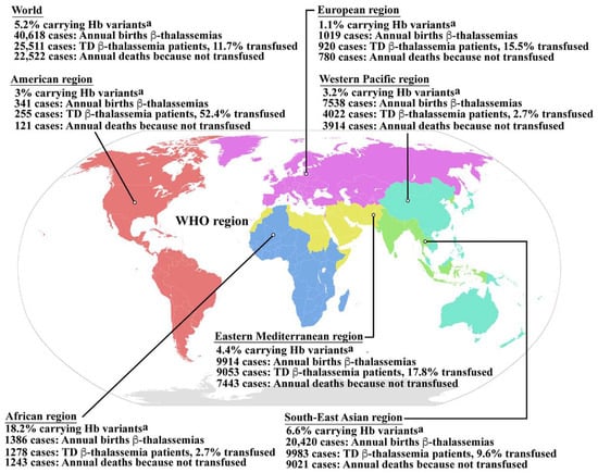 Epidemiology of β-thalassemia. Global epidemiological data including the percentages of populations carrying Hb variants, the number of newborns who have β-thalassemias per year, the number of patients who have TDT, and the percentage of TDT patients who are reached for blood transfusion, and the number of patients who died as a consequence of not receiving blood transfusion worldwide and in the individual sub-regions, according to the World Health Organization (WHO) as reported by Modell B and Darlison M published in the Bull World Health Organ 2008, 86, (6), 480–487 []. a Hemoglobin variants including HbS, HbC, HbE, HbD, etc., β-thalassemia and α-thalassemia. Hb; hemoglobin, TD β-thalassemia; transfusion dependent β-thalassemia. Source of WHO region map; wikipedia.org (accessed in September 2022). The map is in the public domain.