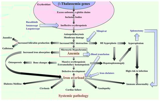 The β-thalassemia or β-thalassemia/HbE patients have imbalanced globin chains, with excess unbound α-globin chains in erythroblasts resulting in ineffective erythropoiesis (Figure 2). The patients suffer from chronic anemia that induces erythropoietin production and consequently stimulates massive erythropoiesis, extramedullary hematopoiesis, and increased iron absorption at the gastrointestinal tract []. Abnormal thalassemic RBCs are commonly cleared by macrophages in the sinusoids of spleen and by the reticuloendothelial (RE) system, where heme is degraded into a porphyrin ring and iron. The iron is recycled, while the porphyrin ring is oxidized to biliverdin and subsequently converted to unconjugated bilirubin and then passively taken into hepatocytes. High levels of bilirubin can cause jaundice and gallstones in patients. The increased number of damaged RBCs stimulate RE hyperplasia and can induce hepatosplenomegaly. In turn, the increased number of RBCs destroyed in the spleen can trigger hyperfunction of macrophages leading to hypersplenism, resulting in severe anemia. Splenectomy is a conventional treatment to cure hypersplenism, but it subsequently increases susceptibility to infection and can promote thrombosis. In addition, massive erythropoiesis in the bone marrow can induce bone changes that contribute to osteoporosis, while extramedullary hematopoiesis can interfere with organ functions leading to additional complications. The conventional treatment for patients with severe anemia is regular blood transfusions. However, increased gastrointestinal iron absorption together with multiple blood transfusion leads patients to suffer from iron overload, which is a serious complication that plays an important role in induced systemic abnormalities such as cardiovasculopathy, cirrhosis, diabetes mellitus, abnormal immunity, and other complications [,,,,,].