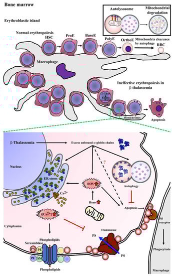 Mechanism of program cell death in bone marrow β-thalassemic erythroblasts. Normal erythropoiesis occurs in bone marrow in the location of an erythroblastic island that contains a macrophage as a feeder cell to product cytokines, which is essential for erythroid differentiation from hematopoietic stem cells (HSCs) to erythroid precursor cells including pronormoblasts (ProE), basophilic normoblasts (BasoE), polychromatophilic normoblasts (PolyE), and orthochromatic normoblasts (OrthoE) and consequently enucleation and mitochondria clearance by autophagy resulting in terminal erythroid differentiation and yielding mature red blood cells (RBCs). In β-thalassemia, excess unbound α-globin chains precipitate into erythroblasts leading to hemichrome accumulation and cellular stress. Autophagy could be a process of cellular adaptation in β-thalassemic erythroblasts to reduce the toxicity from excess unbound α-globin chains by protein degradation and inhibit apoptosis. However, the imbalance of α-globin/non-α-globin and increased heme in erythroblasts cause reactive oxygen species (ROS) generation via the Fenton reaction that consequently induces an ER stress response, resulting in the release of calcium (Ca2+) into cytoplasm. Increased intracellular calcium (i[Ca2+]) effects to activate scramblase but inhibits translocase, leading to the loss of plasma membrane asymmetry, resulting in increased phosphatidylserine (PS) on the outer membrane leaflet. PS-bearing erythroblasts could be cleared by macrophages via PS-PS receptor interaction as the “eat me” signal of phagocytosis.