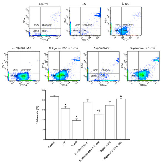 Flow cytometry analysis of Caco-2 cell viability. Viability of Caco-2 cells treated for 8 h with either LPS, E. coli (1:100 Caco-2: E. coli), B. infantis IM-1® (1:30 Caco-2: B. infantis IM-1®) or B. infantis IM-1® supernatant in the presence or absence of E. coli. Results are expressed in percentages as the mean ± SEM of three independent experiments. * p < 0.05 vs. control (untreated cells); $ p < 0.05 vs. B. infantis IM-1®; & p < 0.01 vs. B. infantis IM-1® + E. coli.